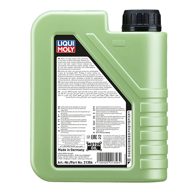 Aceite de motor antifricción de alta tecnología con baja viscosidad y alta estabilidad al cizallamiento. Combinado con tecnología de aditivos innovadora y el aditivo especial Molygen. Evita con seguridad la formación de depósitos, reduce la pérdida de potencia del motor por rozamiento y protege de forma óptima contra el desgaste. De esta forma se reduce el consumo de combustible y se prolonga la vida útil del motor.
