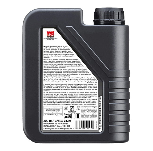 Aceite de motor de alto rendimiento. Máxima potencia y protección del motor en todas las condiciones de servicio. Garantiza una lubricación óptima, una excelente limpieza del motor, magníficos valores de fricción y un desgaste mínimo, así como procesos suaves de embrague, desembrague y cambio de marchas. Sometido a prueba en catalizadores.