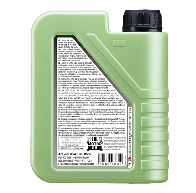 Aceite de motor antifricción de alta tecnología con baja viscosidad y alta estabilidad al cizallamiento. Combinado con tecnología de aditivos innovadora y el aditivo especial Molygen. Evita con seguridad la formación de depósitos, reduce la pérdida de potencia del motor por rozamiento y protege de forma óptima contra el desgaste. De esta forma se reduce el consumo de combustible y se prolonga la vida útil del motor.